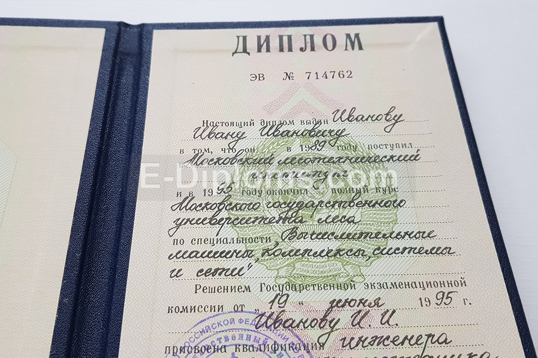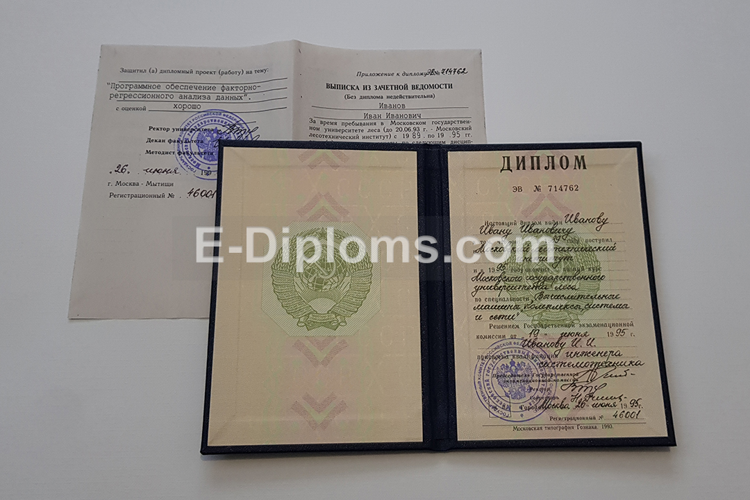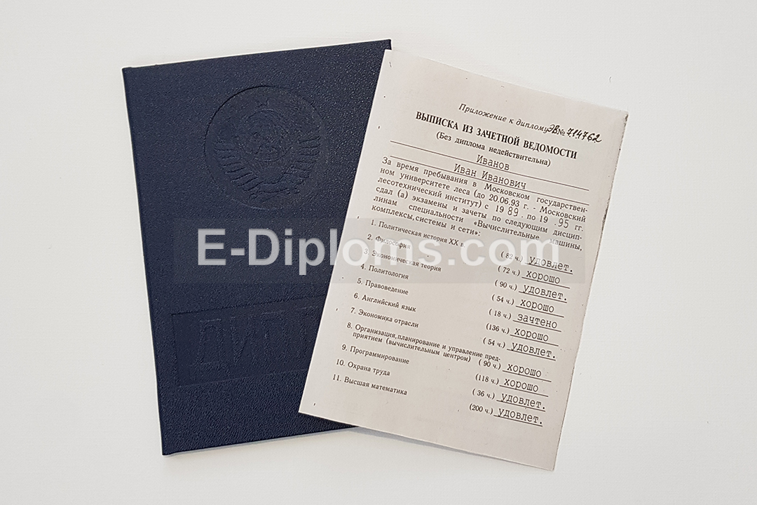 Дипломы на таких же бланках, которые получали выпускники ВУЗов РСФСР (сделаем также дипломы Украины, Беларуси, Грузии и других республик при наличии образца). Учебная программа и все данные соответствуют периоду; ставим гербовую советскую «мокрую» печать и подписи, как в оригинале. Заполняем чернилами и перьевой ручкой, как это делали в институтах и университетах Советского союза. Выписка из зачётной ведомости заполняется от руки или на печатной машинке.