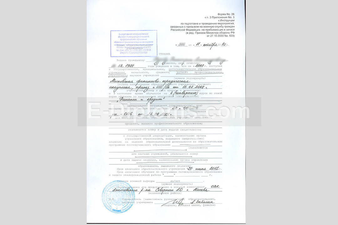 Вы можете купить справку для военкомата с места учебы по форме 26. Ниже представлен образец заполненной справки. К сожалению, цветовая гамма исказилась при сканировании. Реальный документ изготавливается на белой бумаге без каких-либо дефектов. Заполняем по образцу выбранного учебного заведения. Доставка бесплатна, оплата при получении, для проживающих в регионах доступна услуга «макет», есть скидки. При заказе до 14.00 привезем уже завтра!