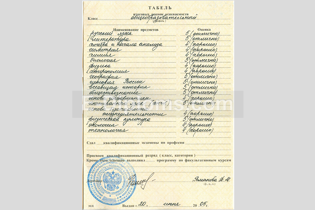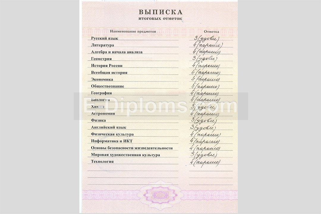 На нашем сайте Вы можете купить приложение к аттестату с нужными оценками как по определенным предметам, так и в процентном соотношении, например 30% — «отлично», 60% — «хорошо», 10% — «удовлетворительно». Это позволит «исправить» средний балл. Обратите внимание, что вкладыш может не соответствовать Вашему аттестату, выданному в школе, т.к. изготовлен на бланке другой типографии (у нас бланки «Гознак»), в таком случае можно заказать полный комплект. Это в большей мере касается новых аттестатов. Сделаем за 1 день, привезём курьером бесплатно и без предоплаты.